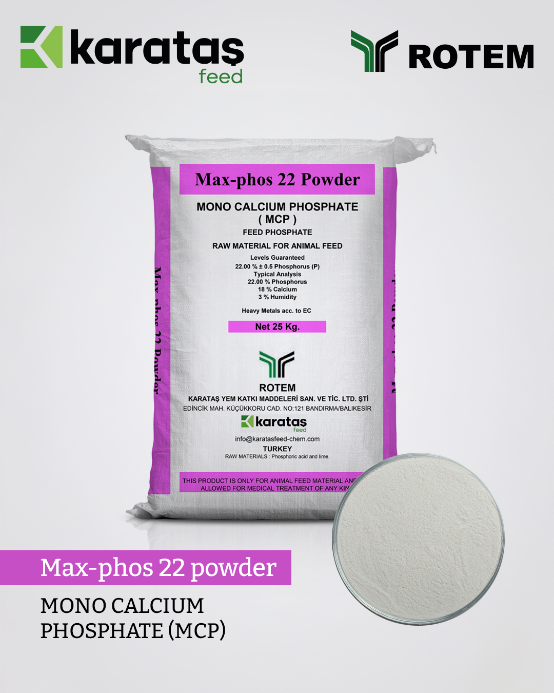Dikalsiyum Fosfat, yem üretiminde ve hayvan beslemede fosfor kaynağı olarak kullanılan mineral kökenli bir hammaddedir.
